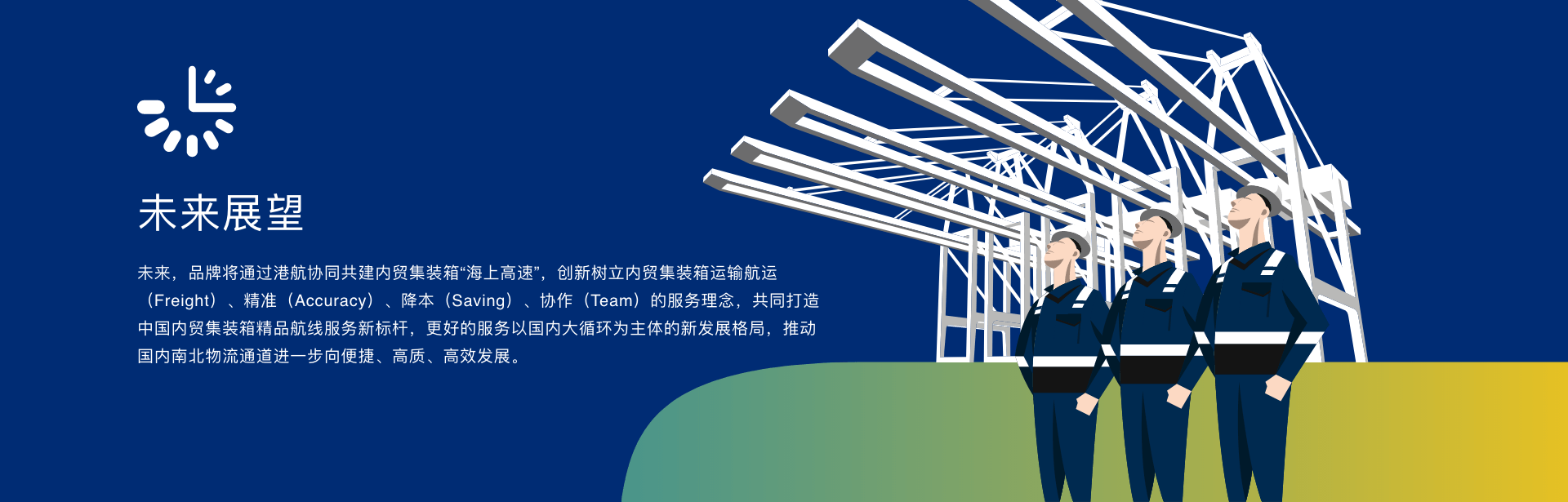 中国内贸集装箱港航服务联盟坚决以贯彻落实国家有关法律法规作为行为准则,坚定以服务新发展格局、国家综合立体交通网等重大战略为己任,坚持以市场为导向,以提升服务为核心产品,通过不断创新和优化内贸集装箱港航服务模式,为国内港口、航运和物流企业及广大客户搭建交流与合作平台,共同将“海上高速-FAST”打造成为内贸集装箱运输标杆服务产品,为我国南北运输大通道更高质量发展贡献港航力量。