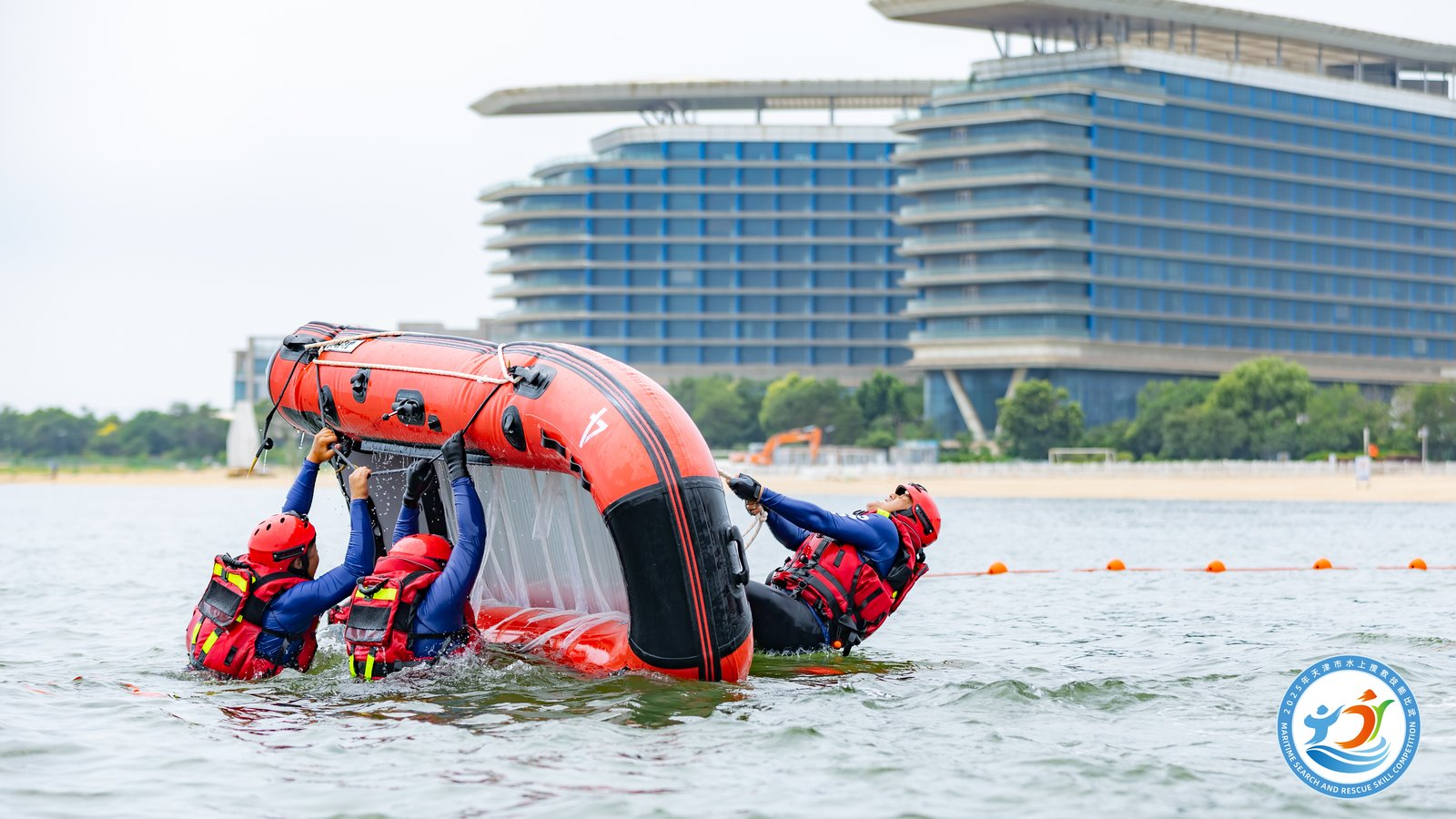 水上科目“翻舟自救”要求4名队员协同将冲锋舟倒扣并扶正,全程需在25米水域内完成。