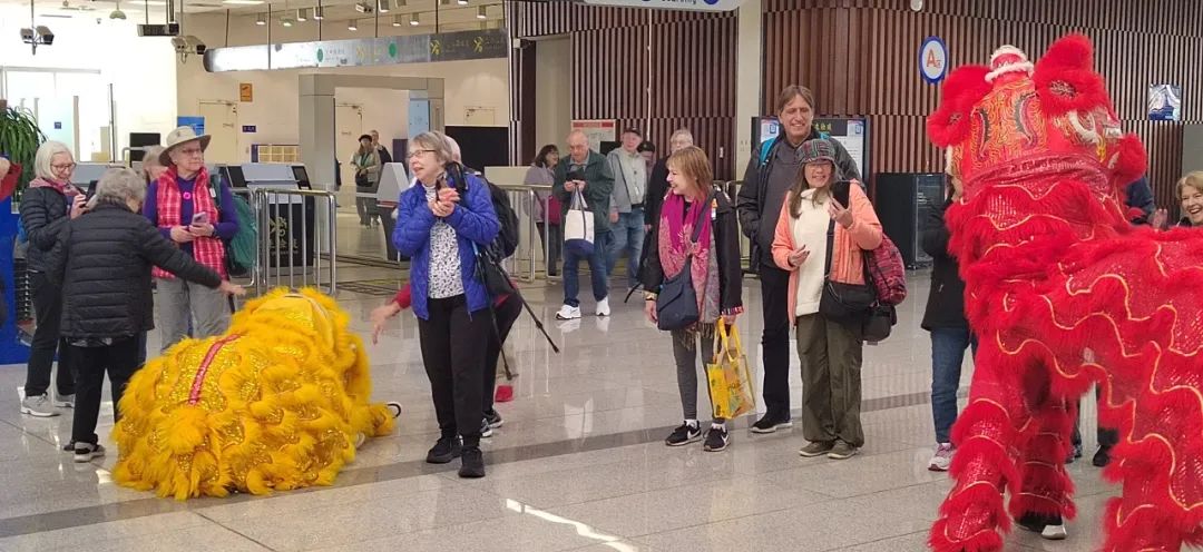 此外,在天津国际邮轮客运大厦内,该公司还准备了舞狮表演,一对喜庆的狮子踩着鼓点舞动,时而憨厚可爱,时而霸气外露,动作千姿百态、形象传神,吸引大量外国游客驻足观看,纷纷拿出手机拍照,记录精彩时刻。