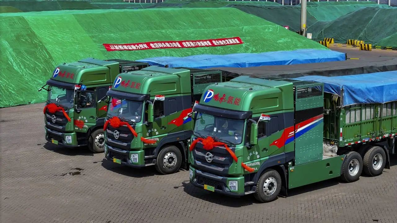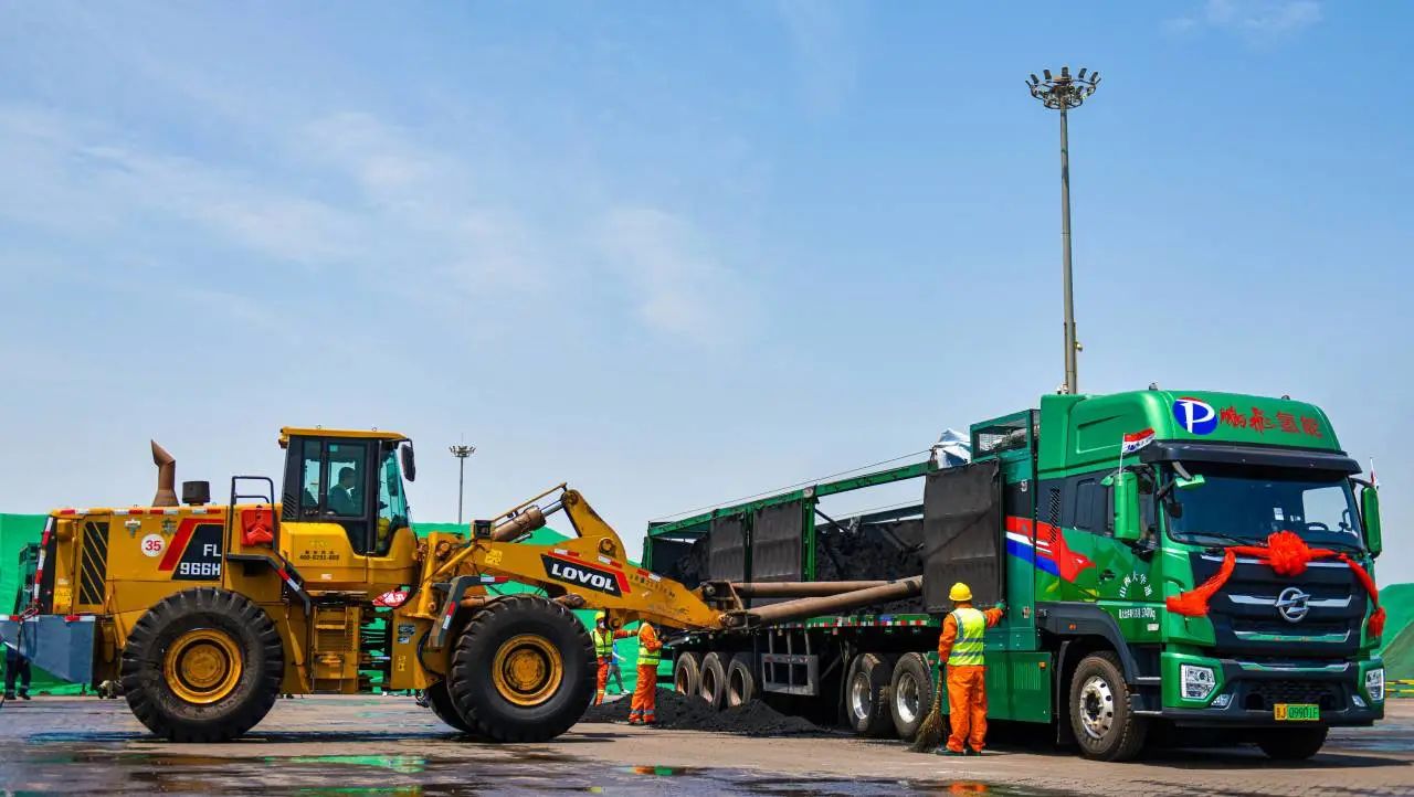 5月29日上午,来自山西鹏飞集团的新能源重卡车队安全抵达天津港南疆中部货场,车上装载的煤炭将从天津港下水装船,再从天津港装载货物运回山西,这标志着山西孝义—天津港的津晋新能源重卡双重零碳物流通道试点运输始发成功。