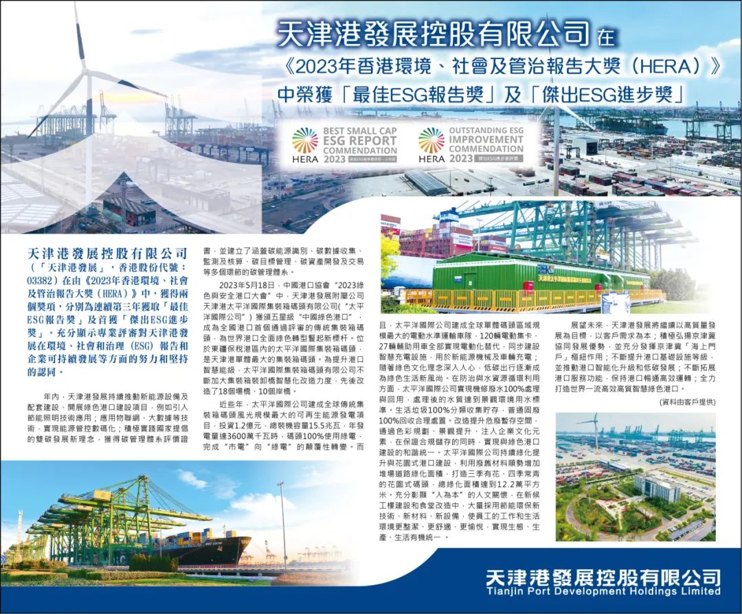 今年,天津港发展控股有限公司(香港股份代号:03382)积极践行国家“双碳”目标,按照天津港打造世界一流绿色智慧枢纽港口发展战略,加快推进港口数字化、智能化、低碳化转型发展,在环境、社会及管治(即“ESG”)管理表现突出,荣获了五项国际奖项。
