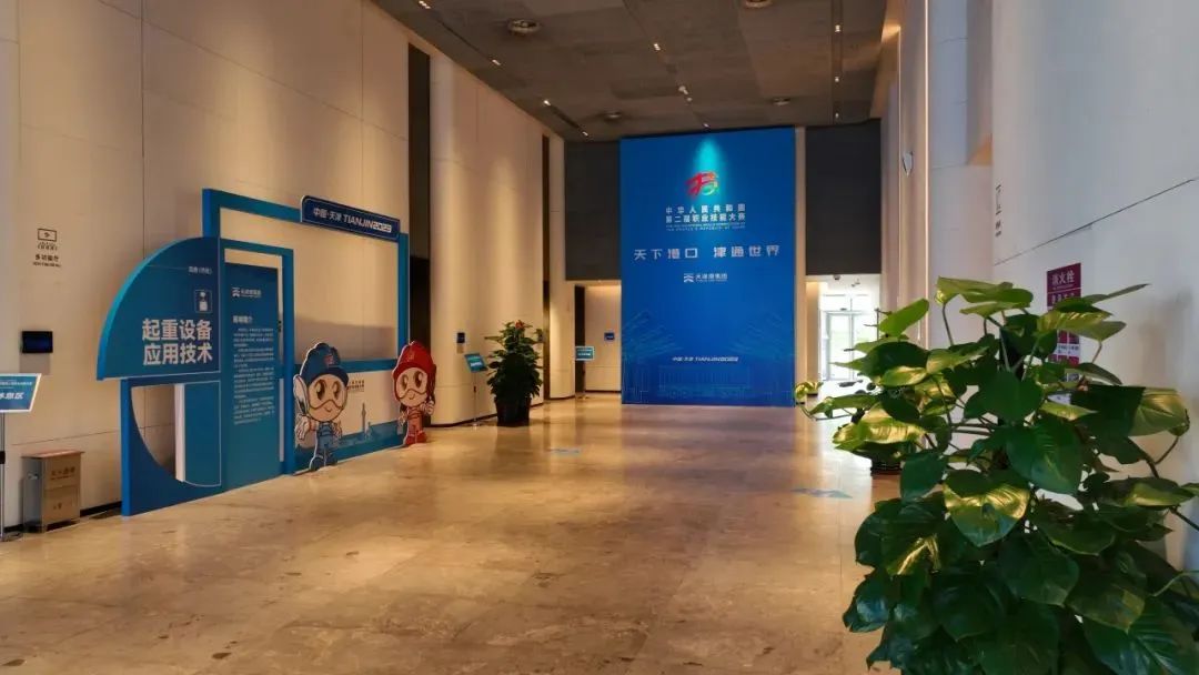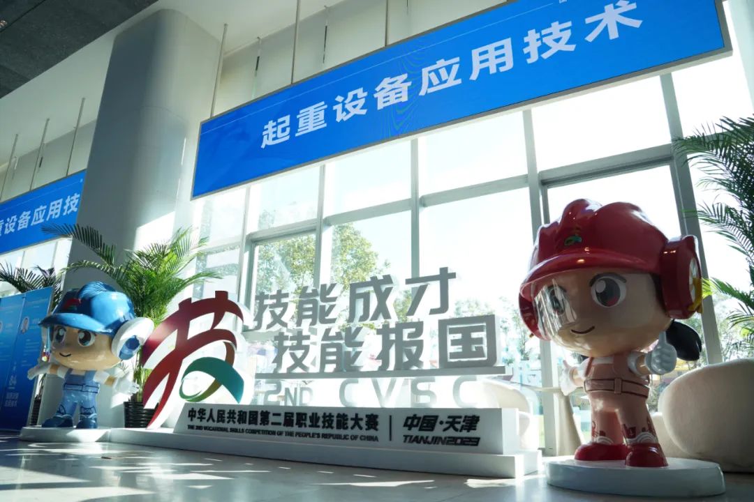在比赛现场,25位参赛选手的背景介绍展板被摆放在了入场大厅的醒目位置。大厅内大赛的主题logo以及象征青春、活力、向上的大赛吉祥物“天天”和“津津”两个卡通青年人物造型格外亮眼,蓝与红的主色调,突出“技能蓝、青春红”,与大赛会标“技”字标识相互呼应,其工装服、安全帽、护目镜等外形设计,形象鲜明地展现了新时代技能人才的外表特征。“天天”“津津”张开双臂、竖起大拇指,象征着天津以更开放、更热情的姿态,迎接来自全国各地的选手和嘉宾到天津参加第二届全国职业技能大赛。