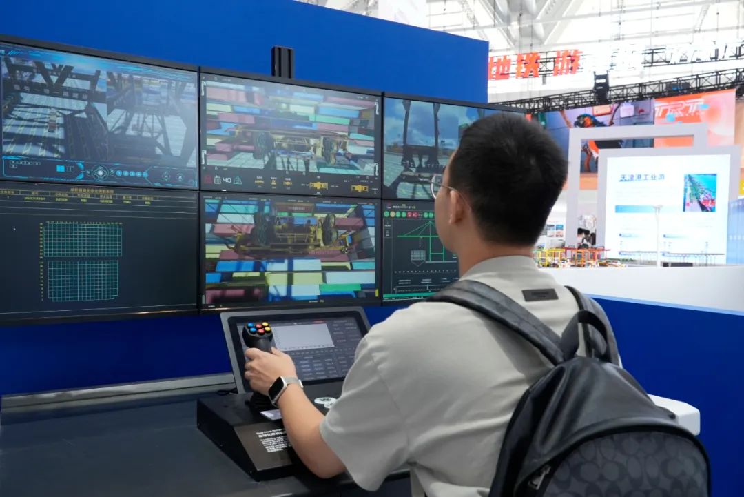 闻名全球的天津港“智慧零碳”码头全景沙盘引人注目,这个码头的“岸桥/场桥远控模拟系统”也来到了旅博会,来自各地游客坐进新时代港口司机的“驾驶台”,通过操作摇杆、触摸屏进行港口仿真模拟作业,现场“试驾”,亲身体验智慧化港口操作过程。