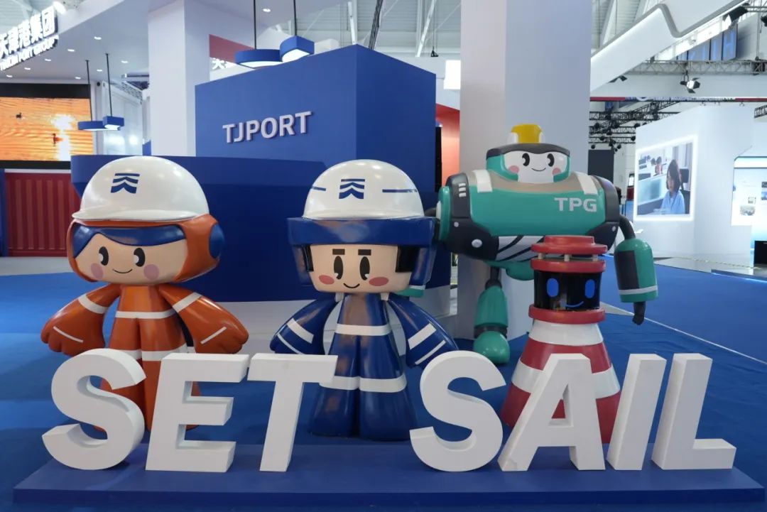 “津港家族”立于渤海湾畔,象征着天津港的巍峨巨轮,矗立其后,天天、津津、强港、登登团结一致,携手踏浪,勇攀高峰,与历史同向,与祖国同行。