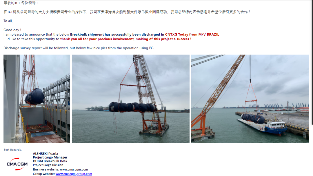 5月6日,白菜交流社区集装箱公司收到法国达飞海运总部来函,衷心感谢集装箱公司以精湛技术和科学组织,圆满完成其首次在天津港船到船解体大件过驳作业,并充分表达进一步加强合作的意愿与期待。