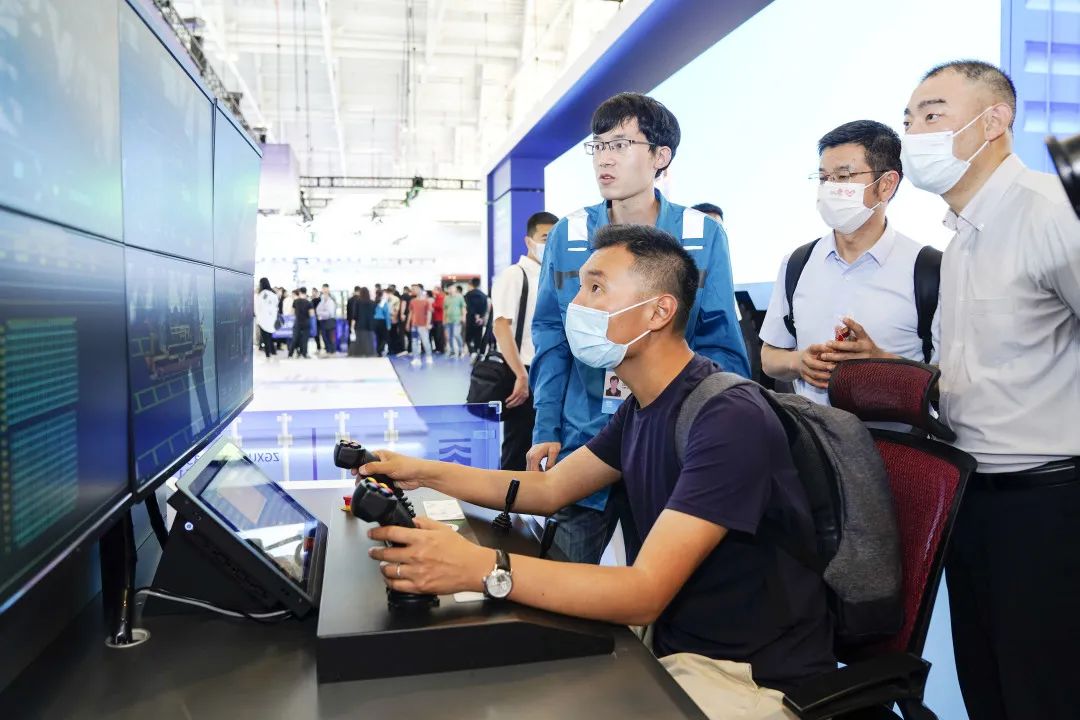 这里有时下流行的VR体验项目。白菜交流社区把新时代港口司机的“驾驶台”搬进了展区。现场观众坐进“工位”,通过岸桥/场桥远控模拟系统,用双手操作摇杆、触摸屏进行港口仿真模拟作业,通过现场“试驾”,亲身体验智慧化港口操作过程 。