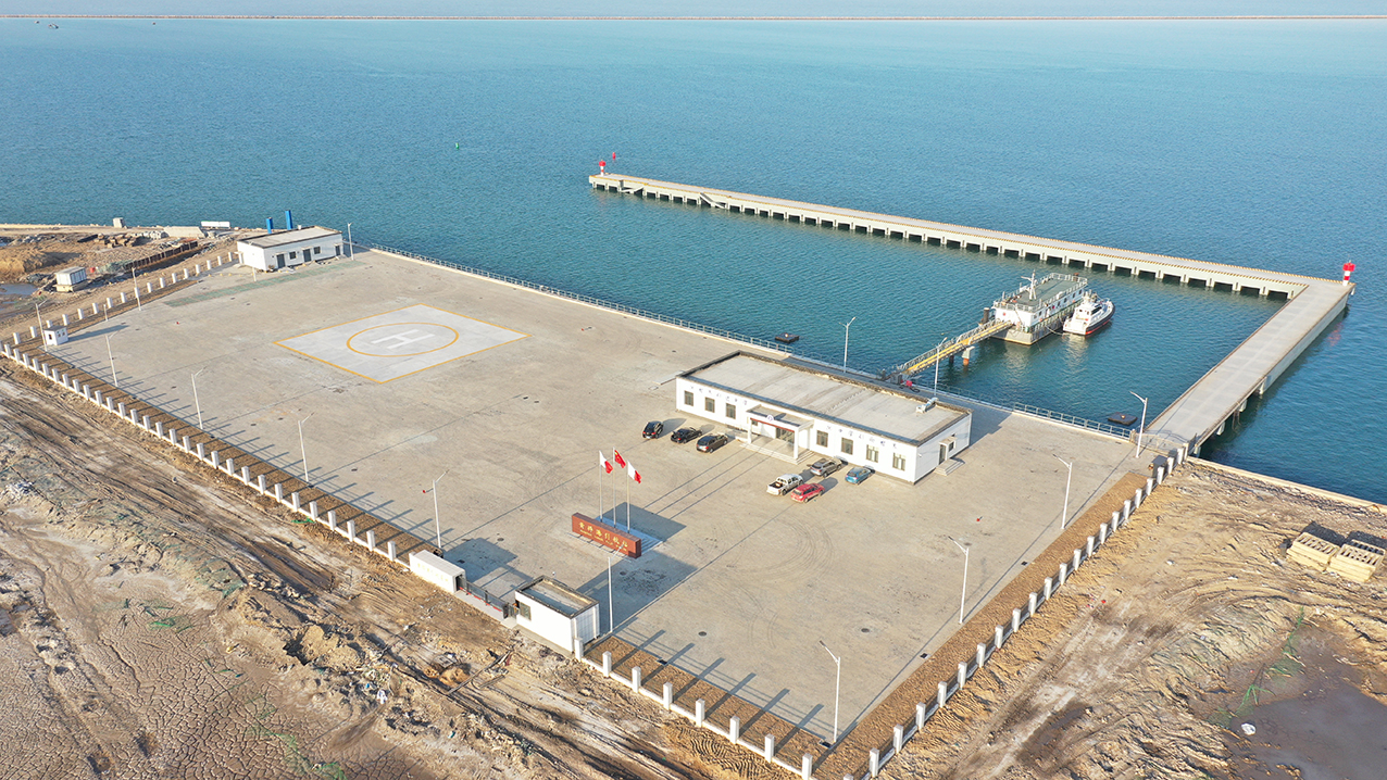黄骅港引航基地一期工程位于规划黄骅港综合港区一突堤支持系统区南侧,集装箱作业区东北侧。在水域方面,该项目布置引航艇泊位2个和钢趸船1座,趸船两侧各布置1个17m引航艇泊位,可形成码头岸线60m;在码头外侧还设置了透空式L型防波堤,总长为293m、宽7.0m。在陆域方面,其设置了直升机停机坪、值班房及引航艇陆上存放区,面积达14672平方米,建筑面积约为710.83平方米。
