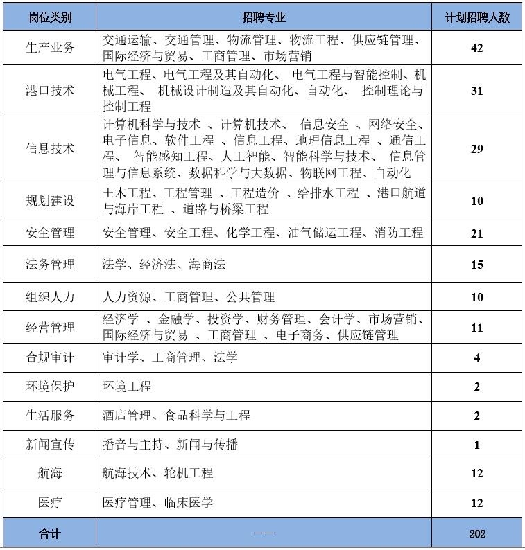 (2)生产业务、港口技术、信息技术、规划建设、安全管理、法务管理、组织人力、合规审计、环境保护、生活服务、新闻宣传、航海和医疗13个岗位:2022、2023届国家计划内具有本科及以上学历、学士及以上学位的普通高等院校应届毕业生。
